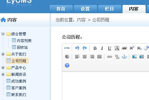 選擇【內容】,點擊左側【公司歷程】后,右側會變成編輯框,然后我們只需要把想要添加的內容寫入編輯器里面,之后點擊【保存】前臺頁面欄目內容就會變成您所編寫的