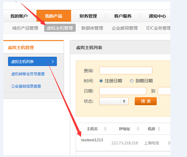 一、登錄會員號以后,在管理首頁導航中點擊“我的產品”,進入“虛擬主機管理”查看相應已開通的虛擬主機產品
