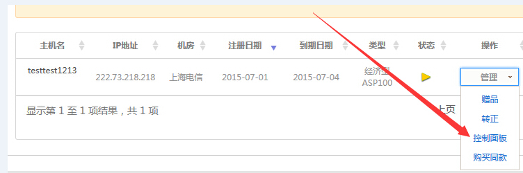 點擊對應虛擬主機名稱的“管理”;,在下拉菜單中點擊“控制面板”進入相應的管理頁面。
