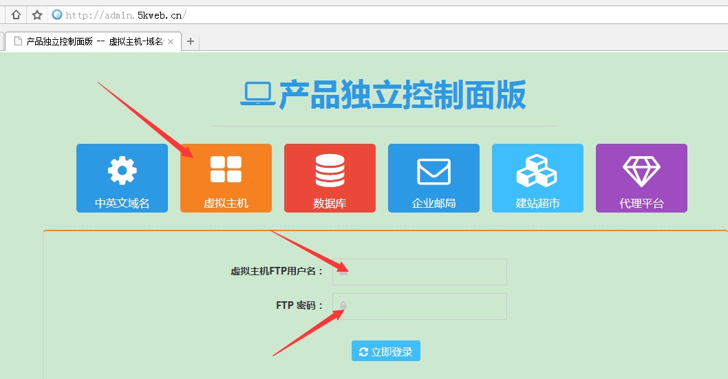 主機管理控制面板也可以通過登錄獨立的控制面板地址admin.5kweb.cn登錄管理,如下圖: